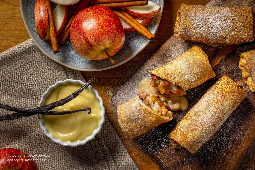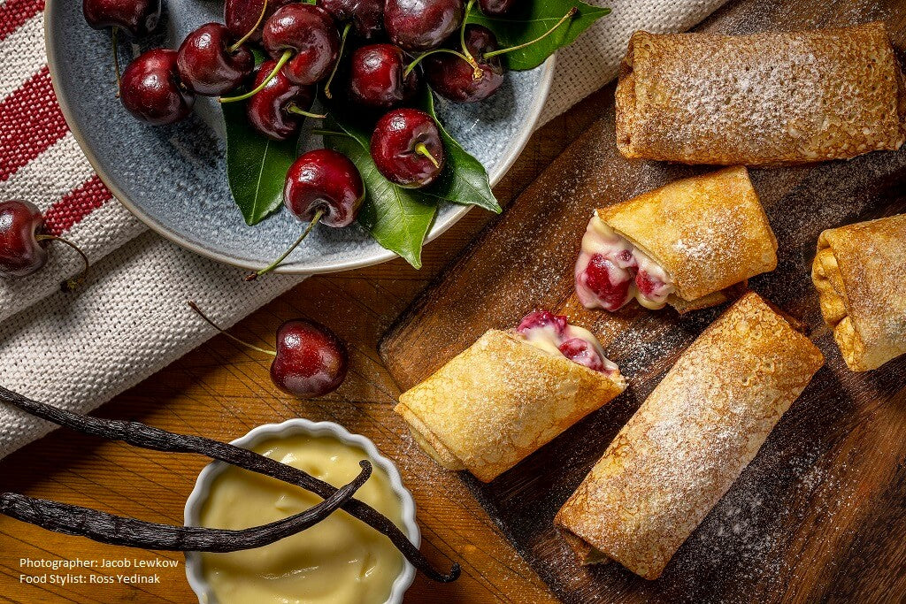 Please enjoy our sweet crepes collection, featuring cherries and vanilla sauce, apples...